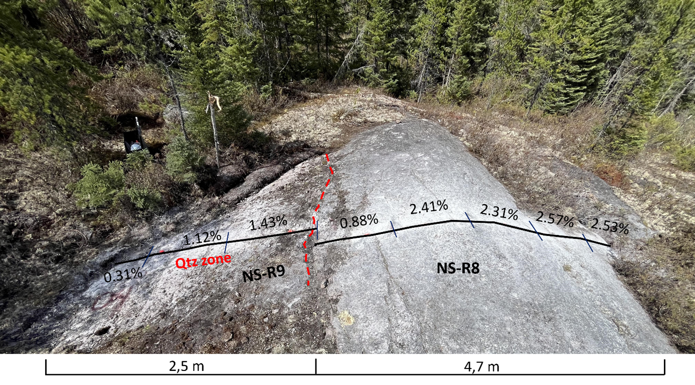 On Vision’s claims, the SC dike is the southern continuation of Winsome’s SC dike where significant widths of LCT mineralization have been reported. The dike can be followed for at least 40 metres south of the boundary before going under overburden, but it likely continues further south. Vision collected six continuous channel samples ranging from 0.5 to 8.3 m, with sample lengths limited by overburden cover.