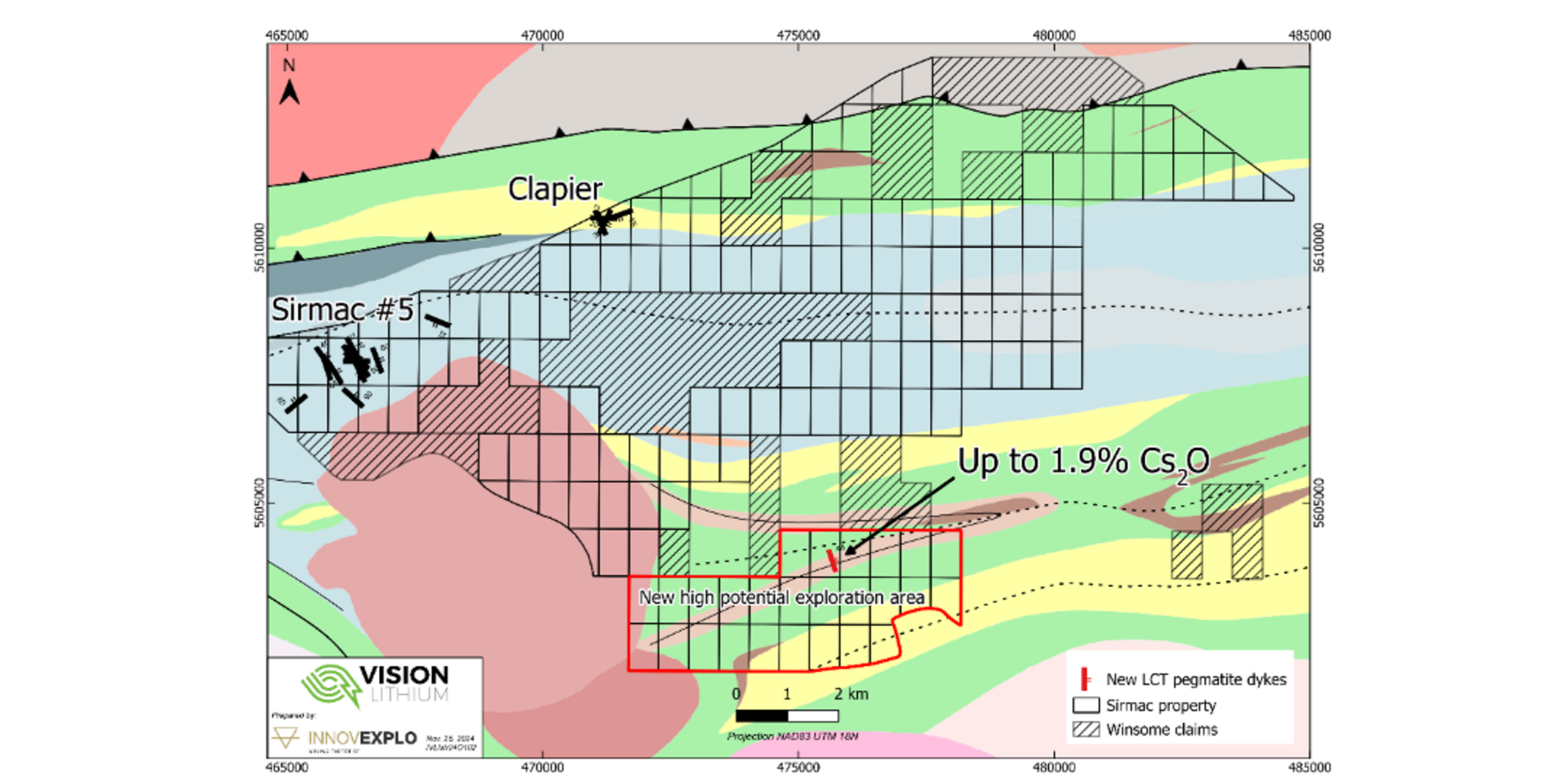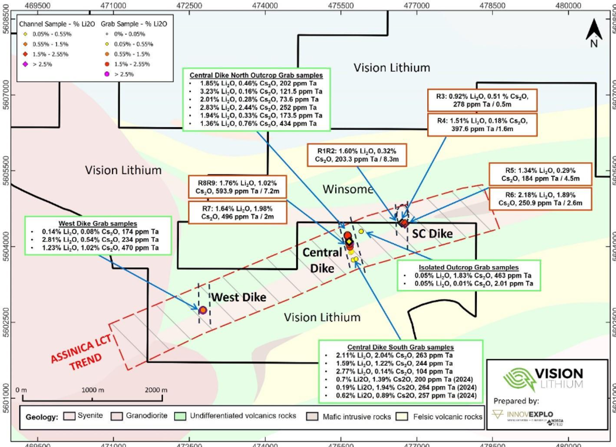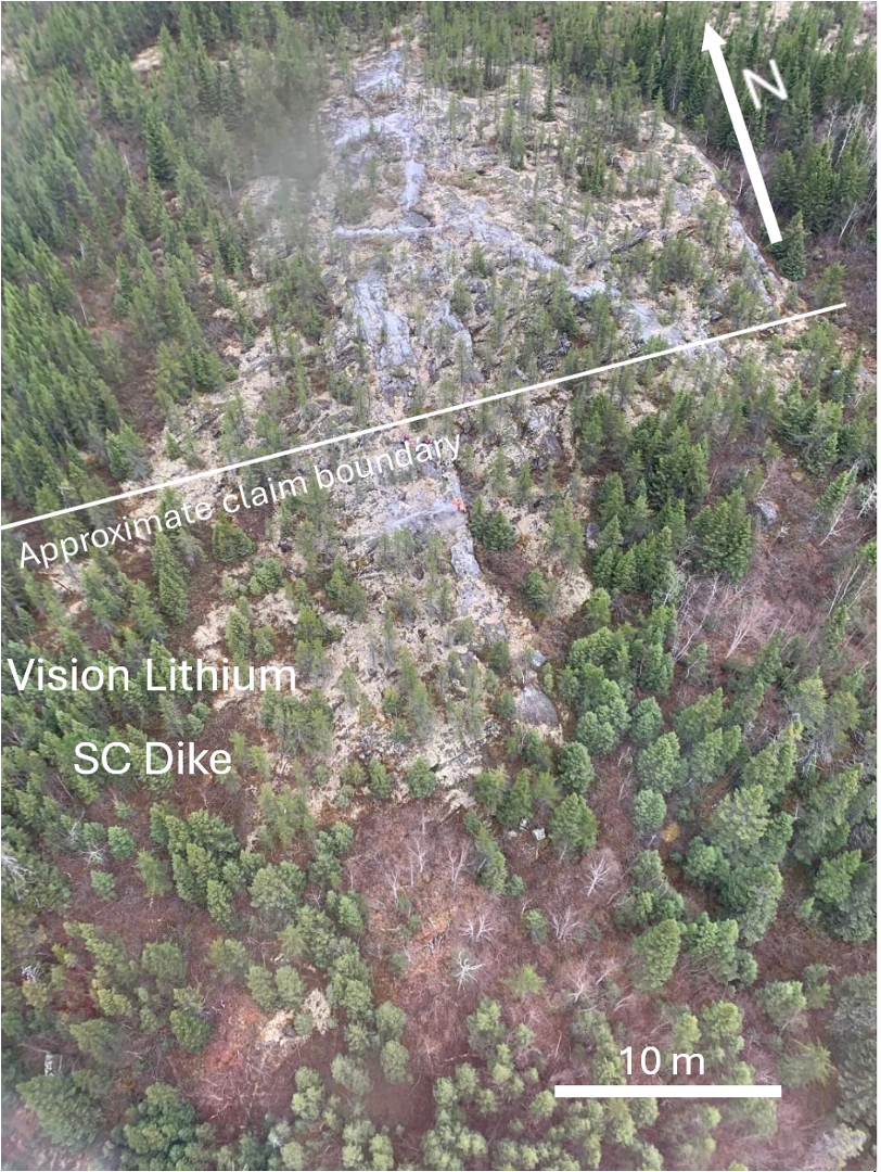 A follow-up field program was planned through the winter, and a 4-man team of geologists and technicians visited the property in May 2025. Several new LCT dike discoveries suggest the existence of a major east-northeast mineralized trend which hosts multiple lithium, cesium and tantalum-rich LCT dikes, and likely includes the Winsome SC occurrence. Vision’s claims cover over 5 km of this trend and new claims staked by Vision east of Elevra/Sayona’s Gariteau claim block could also cover the trend. Isolated mineralized LCT pegmatite outcrops and historical drill-intersected dikes on Vision’s claims are further indications of the potential for discovery along this new trend. The area is generally low relief, overburden covered and may host concealed major dikes near to very-near surface. The similarity between all the dikes discovered to date and the high grades encountered are very positive for this Project going forward.